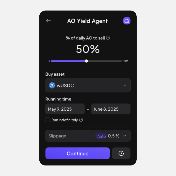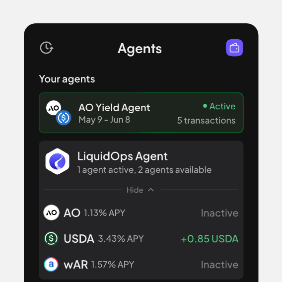 We introduced Agents to help users automate actions inside their wallet. Users can set up rules to automatically convert a percentage of their daily earnings into another token, configure them to run on a schedule (like daily or indefinitely), and manage all active agents from one unified dashboard.